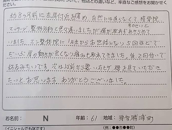 約8ヶ月前に左肩付近を痛め、自然には良くならなくて、接骨院、マッサージ、整形外科といろいろ通いましたが、痛みが取れず、歳のせいと諦めていました。 エン整体院に1月末からお世話になり、5回ほどでだいぶ肩の動きが良くなり、痛みも取れてきました。 あと2回くらいで終わるみたいです。次は以前から悪い右ひざ、腰を施術していただきたいと思います。 ありがとうございました。