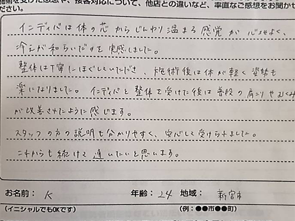 インディバは体の芯からじんわり温まる感覚が心地よく、冷えが和らいだのを実感しました。 整体は丁寧にほぐしていただき、施術後は体が軽く姿勢も楽になりました。 インディバと整体を受けた後は普段の肩こりやむくみが解消されたように感じます。 スタッフの方の説明も分かりやすく、安心して受けられました。 これからも続けて通いたいと思います。