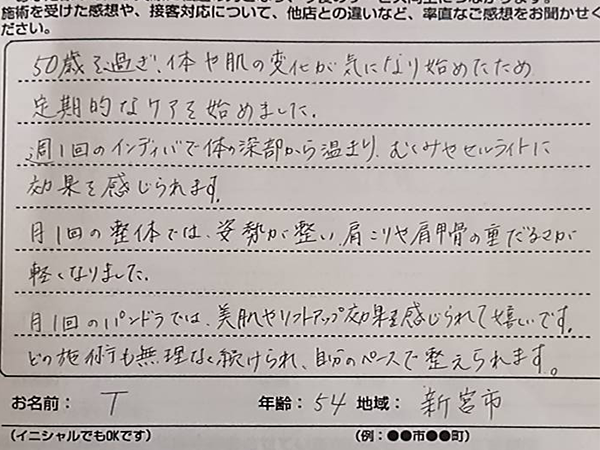 50歳を過ぎ、体や肌の変化が気になり始めたため定期的なケアを始めました。 週1回のインディバで体の深部から温まり、むくみやセルライトに効果を感じられます。 月1回の整体では、姿勢が整い肩こりや肩甲骨の重だるさが軽くなりました。 月1回のパンドラでは、美肌やリフトアップ結果を感じられて嬉しいです。 どの施術も無理なく続けられ、自分のペースで整えられます。