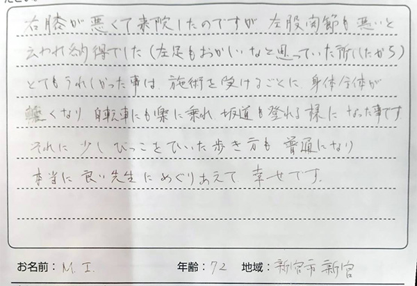右膝が悪くてエン整体院へ足を運びましたが、左股関節も悪いと言われて納得でした。(左足もおかしいなと思っていたところでしたから) とてもうれしかったことは、施術を受けるごとに身体全体が軽くなり、自転車にも楽に乗れ、坂道も登れるようになった事です。 それに少しびっこを引いていた歩き方も普通になり、本当に良い先生に巡り合えて幸せです。